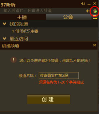 1.在37听听中点击“公会”按钮,创建公会频道;