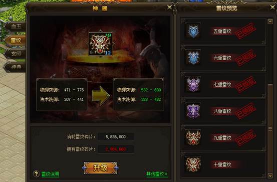 通过击杀强大BOSS和通关材料副本,玩家可以获得极其珍贵的雷灵结晶。使用雷灵结晶可以获得雷纹碎片,当收集雷纹碎片到一定数量,玩家可以激活神器【雷纹】练成雷神体,永久增加自身的防御。