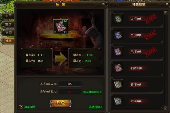 神典,全名太古神典,其威力恐怖莫测,而且记载了堪称逆天般的神通。玩家通过击杀BOSS、通关副本、参与活动,能获得神典图纸,消耗神典图纸可以合成、升级【神典】,从而获得暴击属性。当攻击打出暴击时,还会附带无视防御的暴击力伤害。