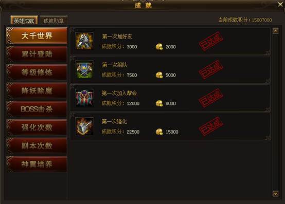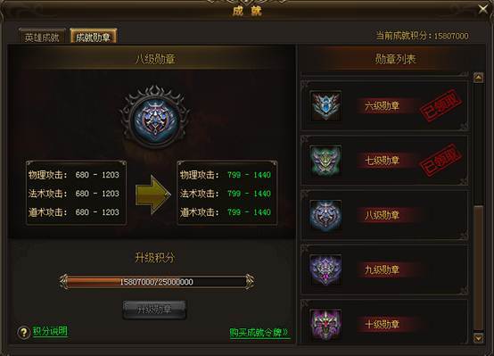 当玩家成就积分积累达到一定的数量,还可以激活成就勋章。勋章可以极大提升人物的攻击属性,让玩家变得更强。