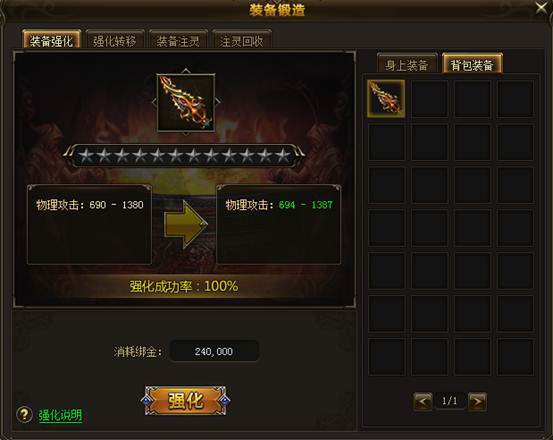 强化作为游戏当中非常具性价比的属性提升方式,深受众多玩家青睐,只需要消耗一定量的绑定金币就可以提升装备的强化等级,取得极大的属性提升。要注意的是,强化是可以转移的,所以尽管大胆强化吧少年,打到好装备强化转移就好了。