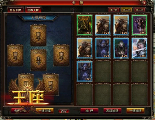37《王座》卡牌具有不同的属性,相同属性的卡牌只能装备一张。在卡牌抽取界面,玩家可以通过抽取卡牌来获得卡牌。卡牌抽取一共有三种方式:第一种是普通抽牌,消耗8000金币抽取一张卡牌。有几率获得紫色卡牌;第二种是高级抽牌,消耗10钻石抽取一次卡牌。有几率获得橙色卡牌;第三种是一键抽牌,这是游戏中VIP5以上玩家的专属特权,自动进行普通抽牌,至卡牌背包满。