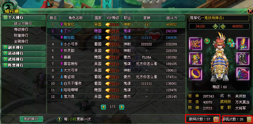 其中排行界面右侧为对应排行的玩家主将信息,包括装备信息,生命、攻击‘防御信息、以及武将技、官职等情况,另外作为一个自由度非常高的三国题材游戏,我们可以通过右侧玩家界面下的崇拜和鄙视次数进行操作。为我们所崇拜的兄弟加油鼓劲。