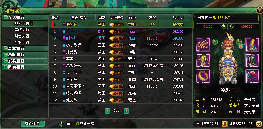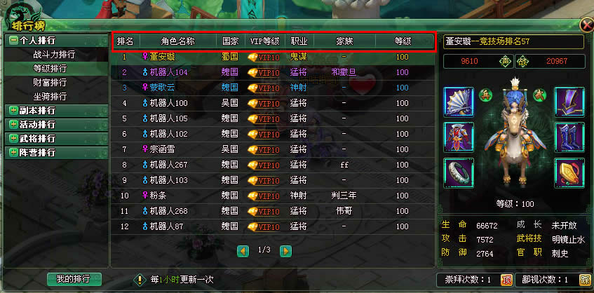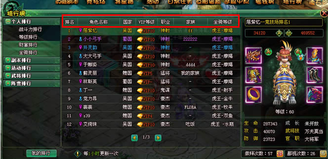 包括排名、角色名、国家、VIP等级、职业、家族、战斗力信息。如下图