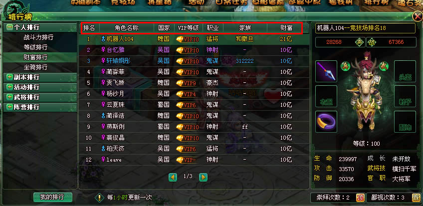 3、等级排行:玩家可以通过财富排行清晰的看到自己所在服务器的财富前30名的排行情况。包括排名、角色名、国家、VIP等级、职业、家族、财富信息。如下图