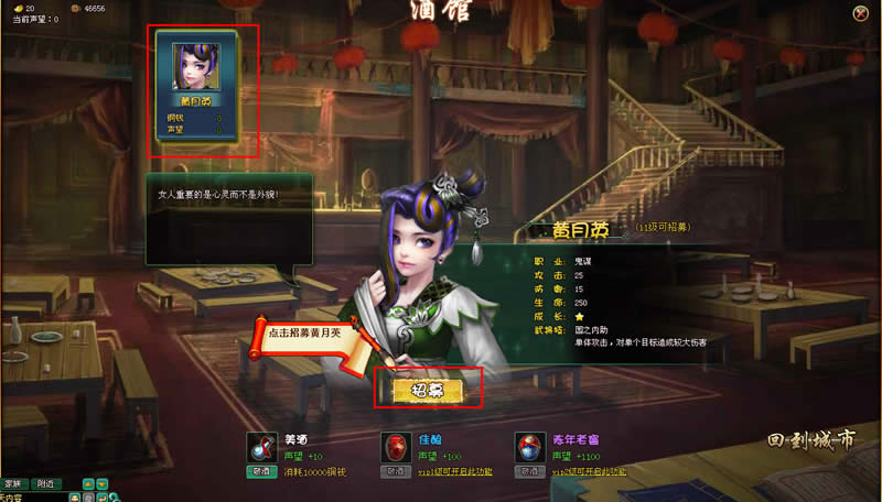 完成剧情后,玩家便可以到到达长安城的酒馆老板出进行武将黄月英的招募。招募完成后,黄月英将自动加入到战斗列表中。