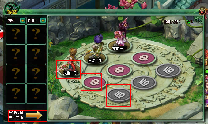 玩家需要点击游戏界面下方的布阵功能条,才可以展开布阵系统,布阵为九宫格。左侧为玩家现有的武将数,此处不包括已经上阵的武将,玩家可以通过将左侧武将拖拽到右侧布阵中,使得武将参加战斗,每名玩家可上阵的武将数会根据玩家等级决定