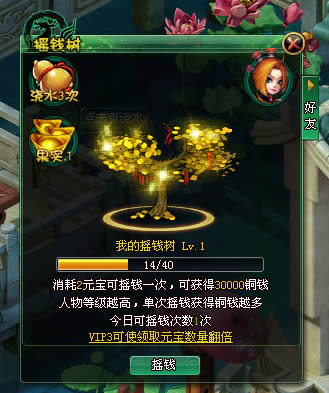 玩家每日对摇钱树进行摇钱操作,每次摇钱都会获得大量的铜钱奖励,玩家的vip等级越高,每日可参与摇钱的次数越多,相对获得的铜钱也就会越多