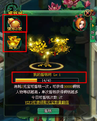 摇钱树功能位置在游戏界面的上方功能条中。点击摇钱树功能后开启摇钱树界面,如下图: