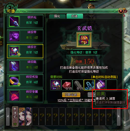 如玩家想要打造的装备缺少材料,玩家可以将鼠标移至缺少的材料上,会显示该材料的产出地点,点击后,系统会为玩家自动寻路到产出锻造材料的副本。