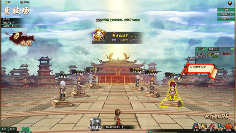 竞技场功能按键放置在游戏界面上方的功能条中,玩家通过点击其他玩家的人物形象,进行PK,胜利的话,将于对应的玩家的竞技场排行对换,每日24点对竞技场进行排名结算,排名越靠前的玩家获得的奖励越好,奖励包括海量铜钱以及大量的声望。