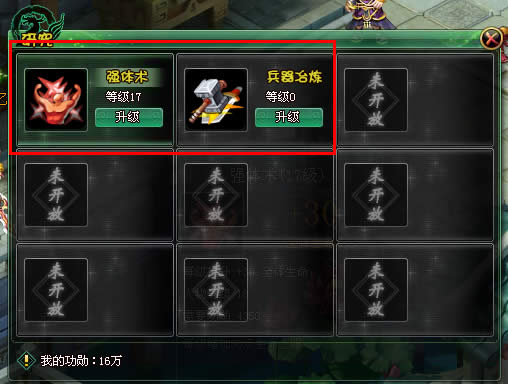 进入研究系统界面后玩家可以看到众多的研究内容,包括强体术、兵器冶炼、护甲术等,不同的研究会产生不同的效果,包括血量增加、攻击增加等。
