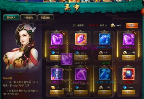 黑市商人:玩家可以在黑市商人那里购买到很多实用的道具,黑市商人的商品每隔一定时间会刷新一次,也可以用黑市刷新令主动刷新。黑市商人处的商品有部分将会不定期打折,手快有,手慢无!