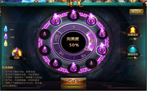 炼气系统:通过炼气系统获得蓝元气、紫元气、橙元气,可以兑换同等品质的雕纹。升级雕纹,战力大涨。