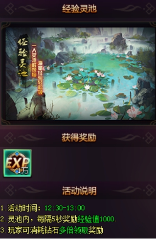 经验灵池:每天固定时间开启,玩家只要身处其中就可以获得大量经验。不动如山,经验飘包,轻轻松松得经验,平平安安升级来。