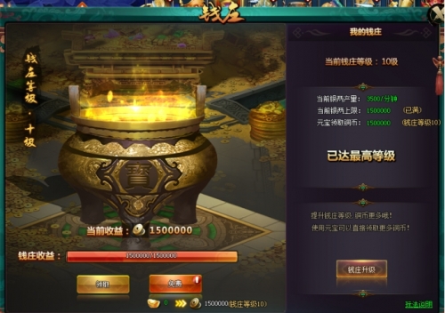 钱庄系统:玩家可以通过钱庄,快速的将手中的元宝兑换成金币。当然,出现兑换暴击的几率也会得到提升。一旦出现暴击,顿时会让你幸福感溢出。钱庄除了直接兑换,还能够随时间的增加自动产生铜币。这是一个没有技巧,完全公平的系统。