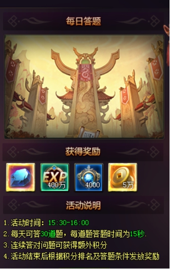 每日答题:王都城汇传来御令,论天下财富,有才者居之,因而吸引无数才子佳人前往参与,发挥才智,回答问题,赢取丰富的奖励。