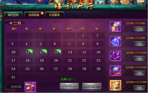 每日签到:玩家们每次进入游戏时,就可以点击签到系统中,进行签到,签到后就可以获得对应的奖励。玩家们连续签到的天数增加后,能够获得的奖励也就越丰富了,轻轻一点,奖励到手。
