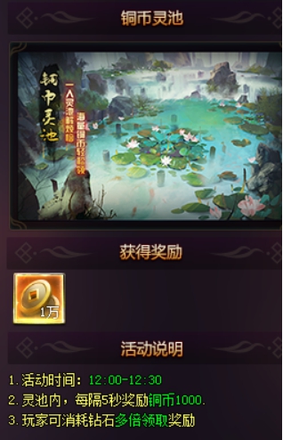 铜币灵池:每天固定时间开启,玩家只要身处其中就可以获得大量铜币。不动如山,铜币飘包,轻轻松松得铜币,平平安安涨战力。