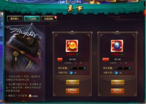 一元抢购:您只需出其中一份的价格,获得一个编号,当这件道具所有"等份"被完全售出后,系统随机抽取一个编号作为"幸运号",此"幸运号"的拥有者即可获得这件道具。