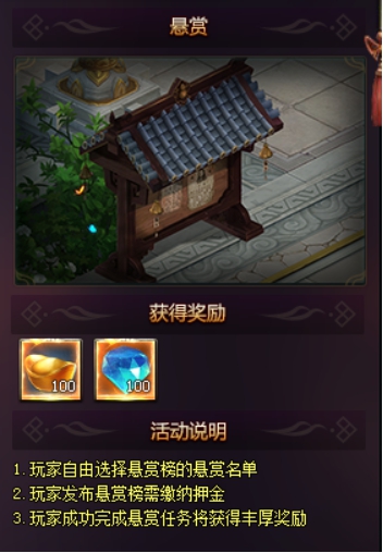 悬赏:付出一定的元宝,将仇人玩家悬赏于众。所有玩家都可以接取悬赏,完成悬赏后将获得元宝赏金。