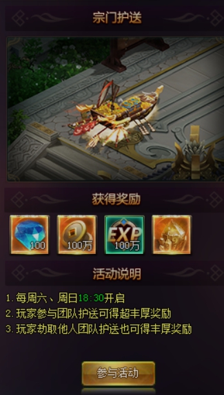 宗门护送:宗门任何人只要玩家等级满足要求均有参与该活动的权限。每个宗门同一时间只可以发布普通战资或豪华战资中的一种,若发布后对应的战资未结束押运,则无法再发布同一种战资押运活动。参与护送的人员越多,战资车加成的生命与防御就越多,并且奖励也越丰富。在护送期间玩家无法进入副本或者参与其它活动。