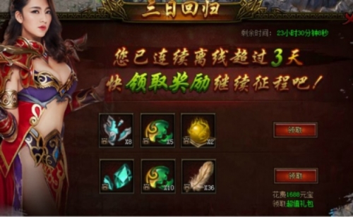 1、离线超过三天的玩家再次登录游戏即可免费领取三日回归大礼。花费元宝更能领取超值回归大礼包;
