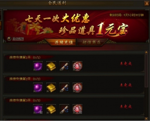 1、每天充值1000元宝或以上,不但可以领取返利奖励,而且可以在超值商店低价购买珍品,第6天更可以1元宝购买价值10000元宝以上的珍品;
