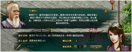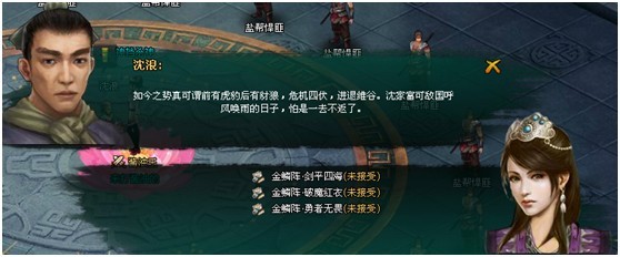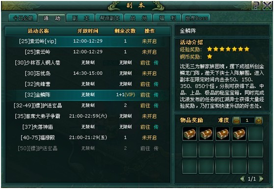 金鳞阵副本 点击右上角的“活”字,在活动界面内查看前往,VIP的情况下每天可以多进入一次,在活动界面内可以查看副本介绍和物品奖励及其难度。 找到活动传送人“马坤归”创建副本 进入副本后可以找NPC“沈浪”接取任务 然后可以开始杀怪了,有时间限制,每次杀怪达50 150 350 850就可以获得宝箱,完成后可以晋级到下一难度副本 宝箱品阶颜色是根据打怪数量来计算,奖励很丰富