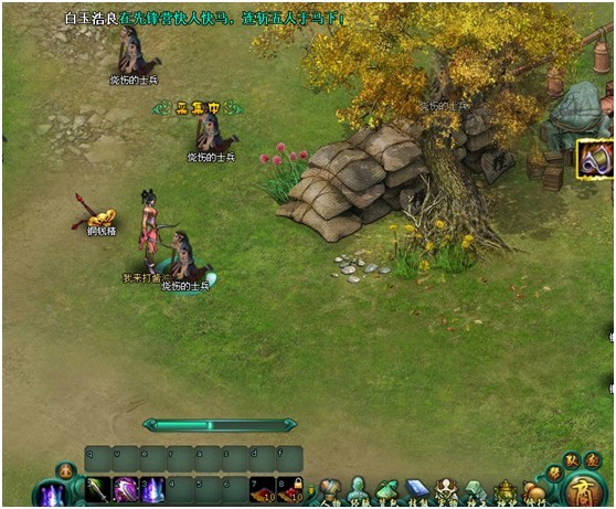 第一次进入游戏会有提示的哦,请跟着新手指引做任务把~~!! 点击,让我们接触第一个NPC新手接引“小昭” 在苍穹破游戏中,有许多的任务是需要通过杀怪来完成的哦,您可以用鼠标点击您需要杀的怪物,点击后怪物身边会出现光环,如下图: 然后您可以使用快捷键“1-0”来编辑技能,点击您所需要使用的技能来攻击怪物。 怪物是会掉落铜钱和道具的哦,看看地上,按“空格”键拾取。 游戏内有部分任务是需要采集地图上的道具的~点击任务来到采集点后,选中道具就可以完成采集喽