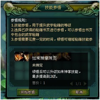 选择用于参悟的秘籍【残页】,通过参悟秘籍残页,获得残页中包含的武学结果。