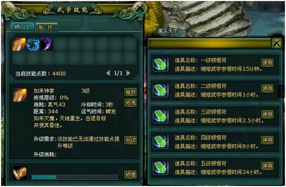 门派技能的升级由加点来实现,而特殊的技能【秘籍】,则需要通过参悟才能升级