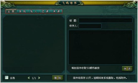 在邮件界面中可以选择邮件的类别进行查看。 发送邮件:标题栏中输入邮件标题,收件人栏中输入需要发送信件对象的角色名,最后写上信件内容点击“发送”按钮即可。