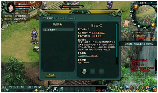 玩家创建角色进入游戏后,新手指导婼妘为你进行一步步游戏基本操作指引。点击新手引导仙子,按照文字提示指引完成第一个任务。