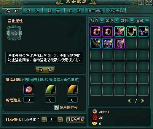 强化需要强化石,左键点击右边需要强化的装备,然后点击强化,在所需材料的下方有个使用保护符,您如不需使用可以把勾去掉,然后点击强化即可,有一定几率失败的,自动强化需VIP4等级才能开启