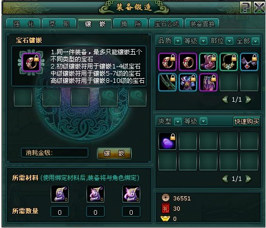 宝石镶嵌:点击右方需要镶嵌宝石的装备,在点击需要镶嵌的宝石后,点击镶嵌,当然镶嵌需要镶嵌符,也是有等级限制的。