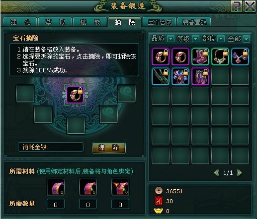 摘除:这个功能就是把装备上的宝石给拆除下来,需要摘除符也有等级限制的哦,从右边把需要摘除的装备点击放到左边,在装备下方会显示出装备上的宝石,您可以选择宝石后点击摘除即可。