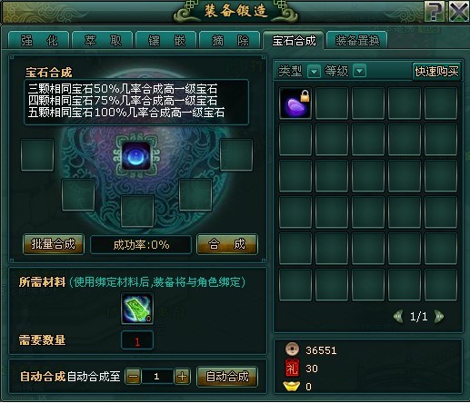 宝石合成:将同类宝石合成更高等级的宝石,需宝石合成符