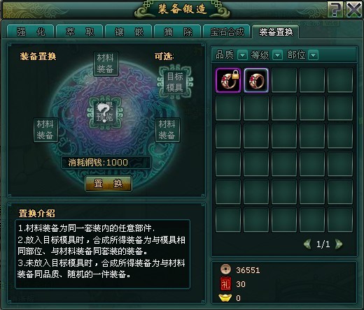 装备置换:意思就是把三件不用的装备转换成您需要的装备部件,装备置换需要3件装备和模具,三件装备+一件模具就可以置换了