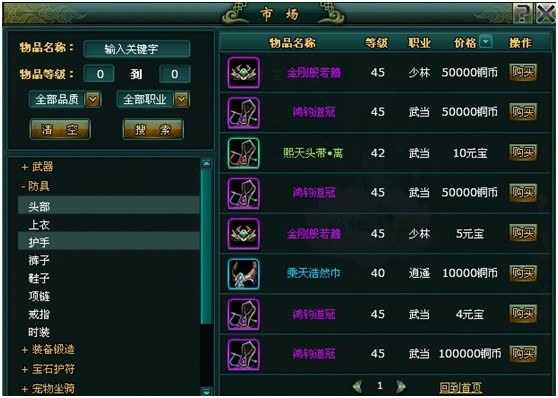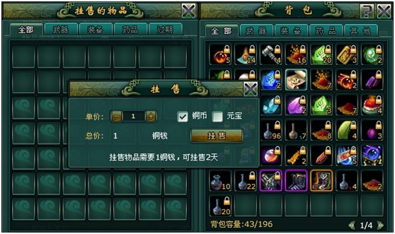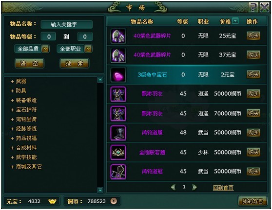 点击右下角的市场可以进入到市场拍卖界面 在市场界面中可以看到其他玩家所拍卖的各种道具,如果是装备的话会显示需要的职业以及等级要求。 点击我的寄售可以把需要出售的道具或装备移动到挂销的物品栏中,输入单价后点击挂售就可以在市场中看到了 市场的左下放可以进行不同种类道具的分类查询,左上方则可以直接输入物品名称,等级,品质,职业进行搜索。 最后,对您选中的道具和装备点击购买,就可以在您的背包中看见了。