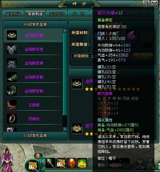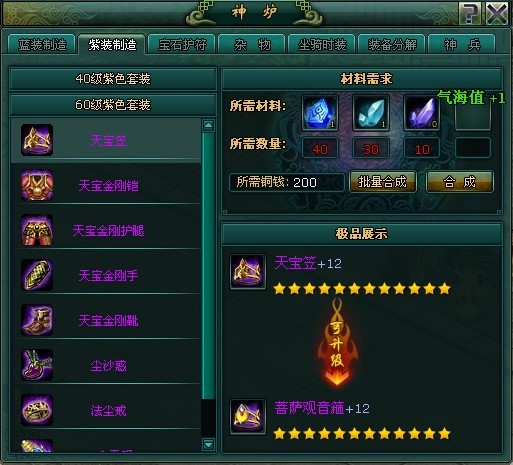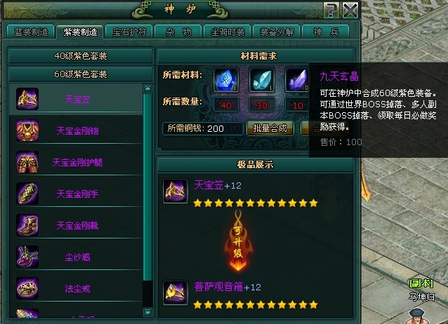 现在为您介绍下一件50级和70级紫色橙色极品装备是如何入手的。有以下几个步骤,首先说明下“紫装制造”点击右下角的“神炉”进入紫装制造界面上显示为40级与60级的紫色套装部件,还有材料需求及其成品装备的进阶升级。