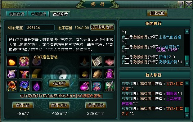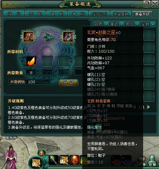 最后说下橙装,橙色装备也是分两个阶段和紫色装备是一样的,只是橙色装备只能靠“修行”获得,同样的道理,40级橙色装备升50级橙色装备,60级橙色装备升级为70级橙色装备,换言之,你在修行过程中只能获得40级和60级的两套橙色装备,装备升级的方法同紫色装备一样。如下图: