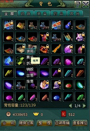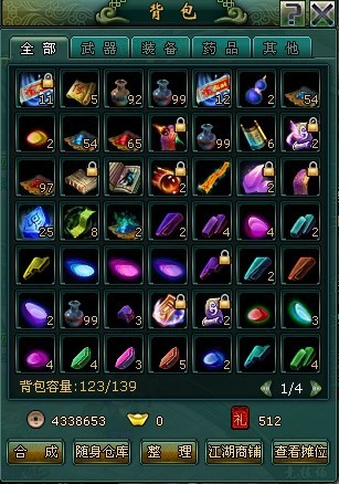 背包中又细分为“全部”、“武器”、“装备”、“药品”、“其他”,每个小类可以让大家方便的查找道具~