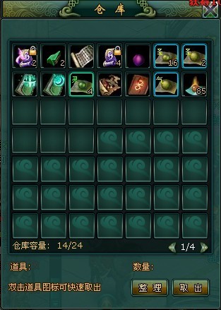 输入数量并确认之后,即可完成购买并弹出随身仓库界面,双击或者拖动道具都可进行存入或取出操作,随身仓库让您可以很方便的存放道具~解决了您在练级中背包空格不够的一大难题^_^