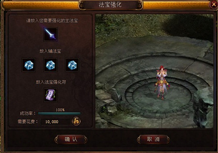 法宝可在圣殿山“宝儿”处进行强化。一个主法宝,三个与主法宝同等级、同品阶的辅法宝,加上法宝强化符后,可开启强化。