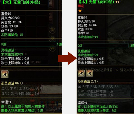 强化成功后,主法宝等级上升,各项属性值提高,而辅法宝则会消失。