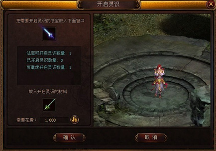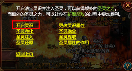 第一步:和圣殿浮浮岛“宝儿”(64,90)对话,首先在对话框中选择“法宝相关”,再选择“法宝注灵”,最后选择“开启灵识”。将您的法宝和开启灵识材料放在对应的位置,最后点“确认”。