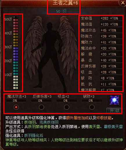 3.右侧为神翼属性加成列表,表示当前等级的神翼对人物属性的加成值。