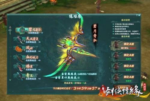 练功房:练功房为在线多人挂机场景,每日可累计挂机一定时间,在此场景中最多可同时使用一定数量的兵器练功。由于练功房为替身练功,因此玩家离开练功房后,并不会影响练功状态。 需要注意的是,在练功房中是无法使用熟练度卡的。