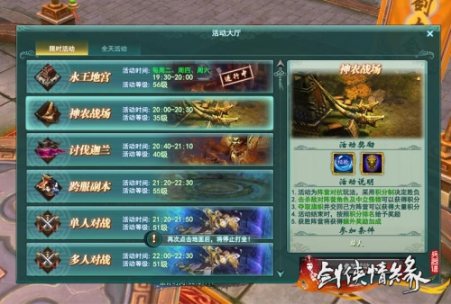 神农战场:神农战场为积分制阵营对抗活动,在活动中击杀敌对阵营角色及中立怪物可以获得积分,同时,夺取旗帜并交回己方阵营也可获得大量积分,积分多的阵营为获胜方。活动结束时,按照积分排名给予奖励,如果获胜阵营将获得额外奖励加成。